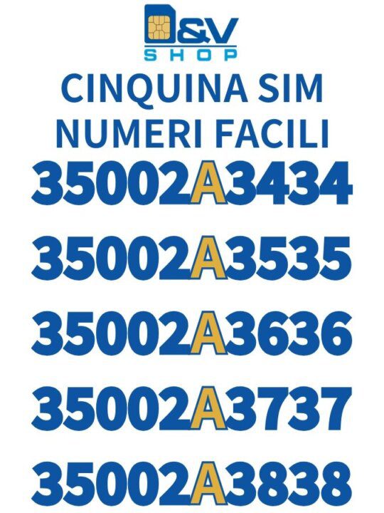 Ho acquistato una SIM da D&V Shop e sono rimasto molto soddisfatto. Hanno un’ampia scelta di numeri facili e particolari. L’acquisto è stato veloce e molto semplice e la spedizione rapida.